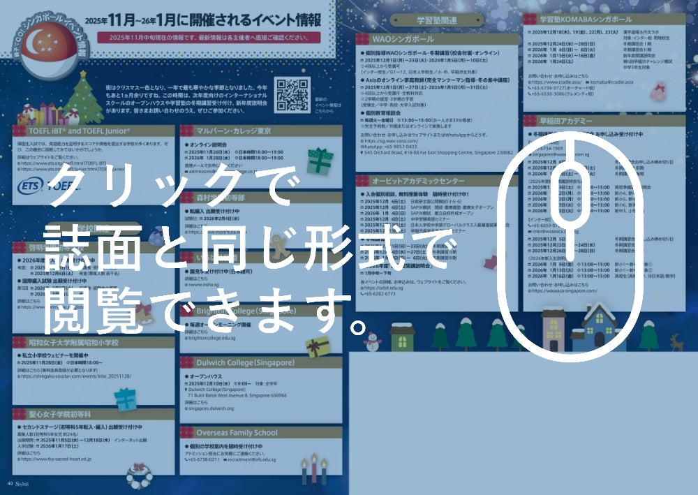 街はクリスマス一色となり、一年で最も華やかな季節となりました。今年もあと1ヵ月余りですね。この時期は、次年度向けのインターナショナルスクールのオープンハウスや学習塾の冬期講習受け付け、新年度説明会があります。皆さまお誘い合わせのうえ、ぜひご参加ください。