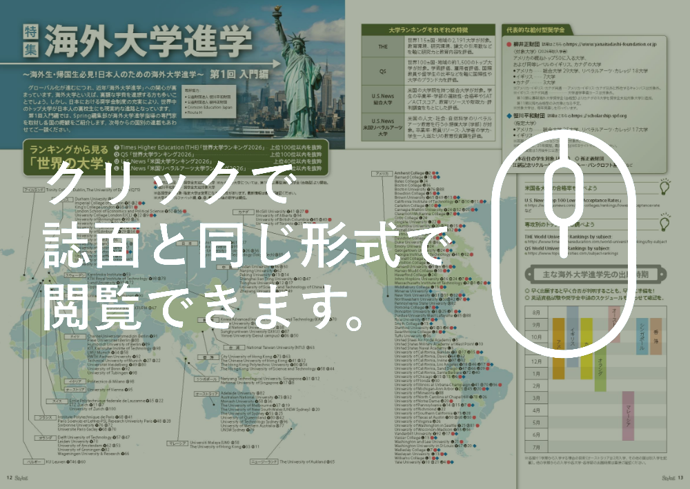 第1回入門編では、Spring編集部が海外大学進学指導の専門家を取材し各国の概観をご紹介します。次号からの国別の連載もあわせてご一読ください。