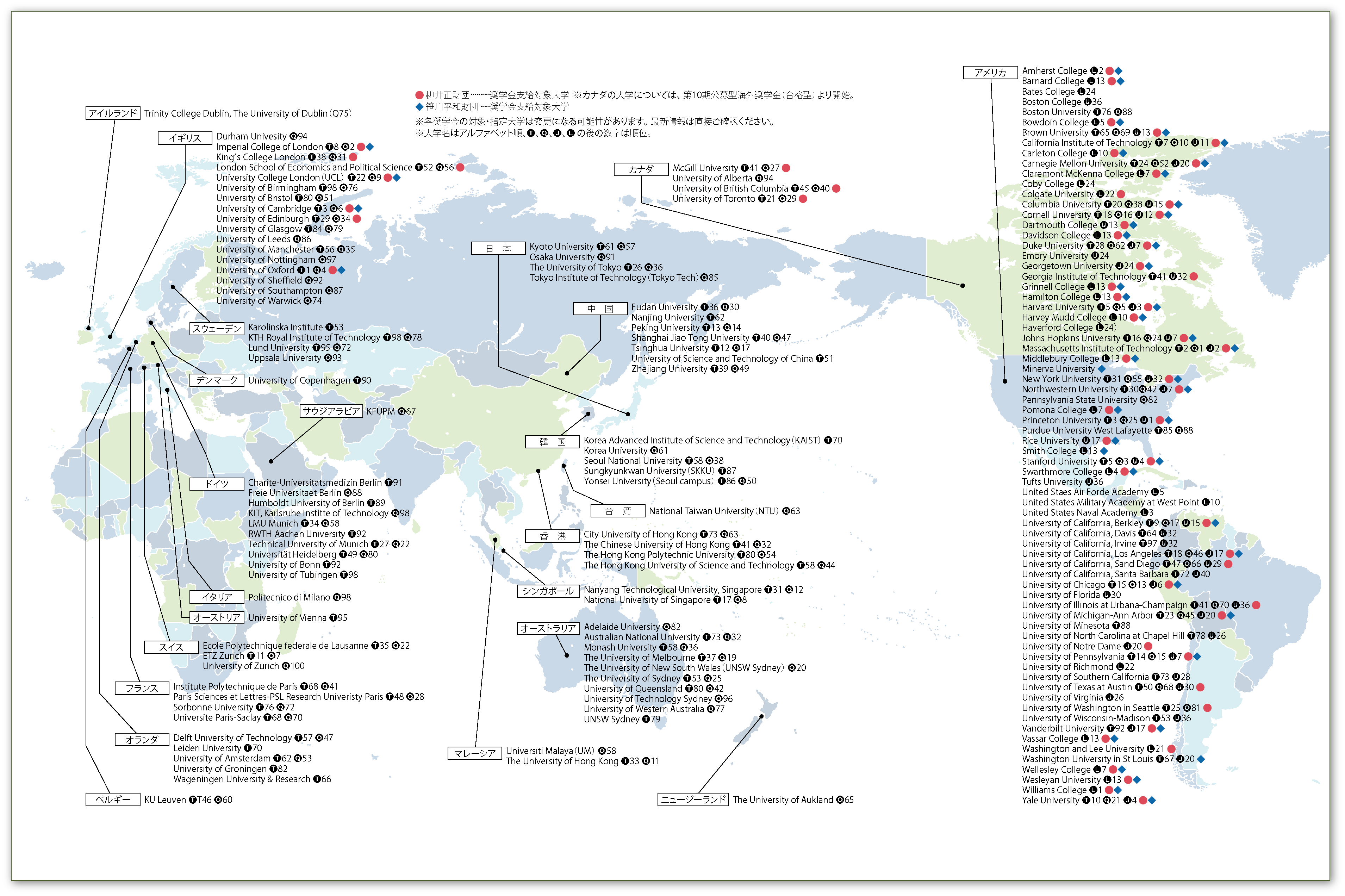 | THE | 世界115ヵ国・地域の2,191大学が対象。教育環境、研究環境、論文の引用数などを軸に研究力と教育内容を評価。 |