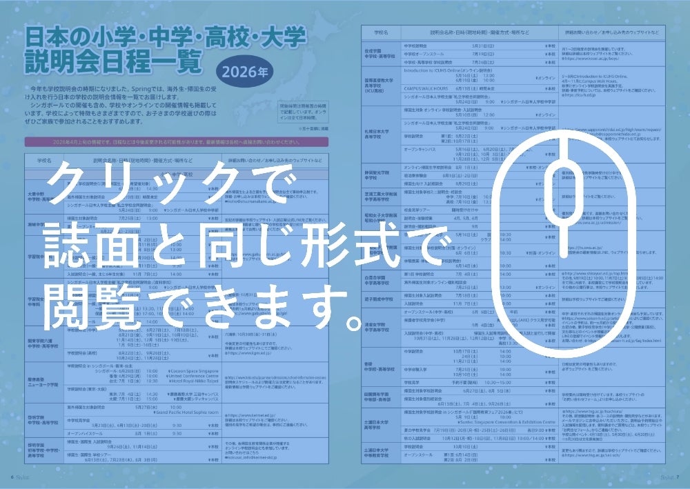 今年も学校説明会の時期になりました。Springでは、海外生・帰国生の受け入れを行う日本の学校の説明会情報を一覧でお届けします。シンガポールでの開催も含め、学校やオンラインでの開催情報も掲載しています。学校によって特徴もさまざまですので、お子さまの学校選びの際はぜひご家族で参加されることをおすすめします。