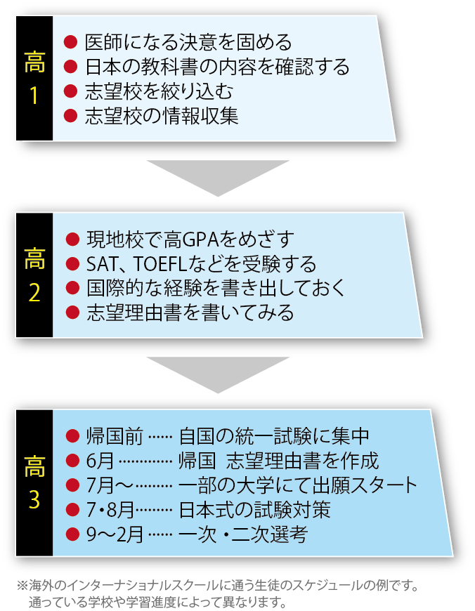 滞在国の現地校やインターナショナルスクールで、IB やAPを学んでいる場合でも、日本語力の強化と日本の医学部入試特有の学力・試験形式への対応をバランスよく進めることが合格への鍵となります。