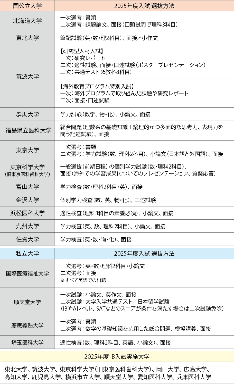 東北大学医学部医学科、東京科学大学医学部医学科、筑波大学医学群医学類、