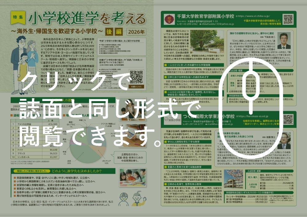 前編では日本の小学校7校および在外教育施設での取り組みとともに、「英語・日本語の育み方」についてご紹介しました。後編では、新たに小学校5校の取り組みと、「日本人としての素養」「帰国後準備」について取材しました。海外生活の中で小学校に向けた教育方針をご家庭で検討するために、ぜひお役立てください。