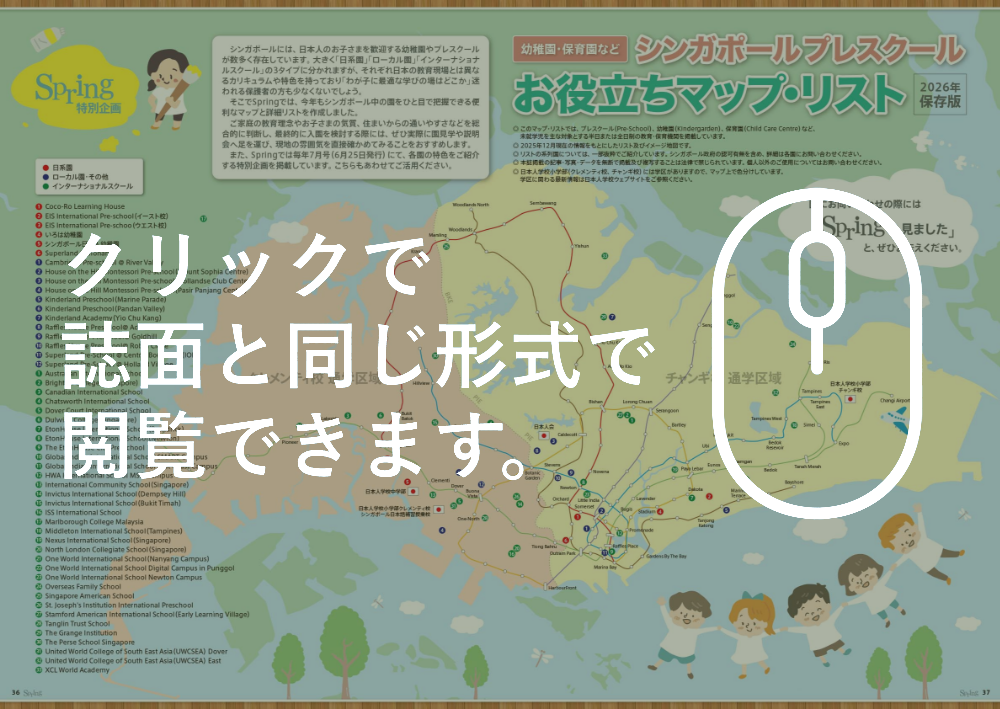 そこでSpringでは、今年もシンガポール中の園をひと目で把握できる便利なマップと詳細リストを作成しました。 ご家庭の教育理念やお子さまの気質、住まいからの通いやすさなどを総合的に判断し、最終的に入園を検討する際には、ぜひ実際に園見学や説明会へ足を運び、現地の雰囲気を直接確かめてみることをおすすめします。
