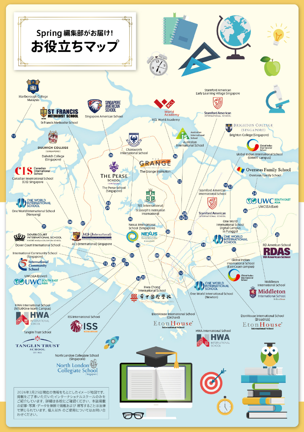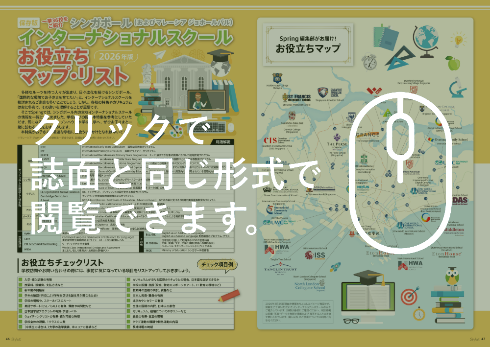 そこでSpringでは、シンガポール内の主なインターナショナルスクールの情報を一覧にまとめました。学校選びの際は本特集を参考にしていただき、気になる学校のオープンハウスや学校見学へ、ぜひお子さまと一緒に訪ねることをおすすめします。 本特集がお子さまに最適な学校に出会うきっかけとなれば幸いです。