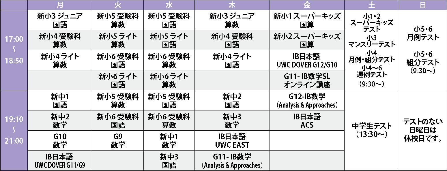 2026年度(新学年) 時間割 ※2026年1月24日(土)までの体験授業は現学年の授業をお選びください。